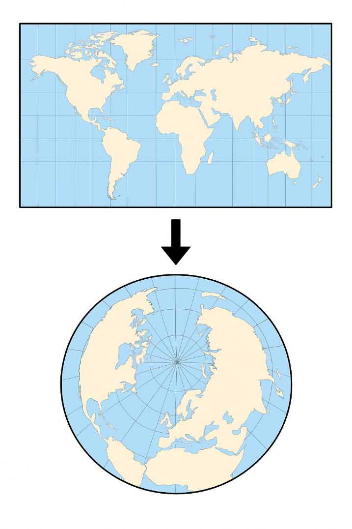 Иллюстрации показывают, как попытка отобразить проекционную координатную систему в географических координатах приводит к сильным искажениям карты. В верхней части изображена привычная прямоугольная карта мира, где широта и долгота представлены как равномерная сетка. При переходе к нижнему изображению видно, что при «обратном» отображении проекции в географическое пространство поверхность Земли перестаёт корректно укладываться в плоскость: меридианы сходятся, параллели искривляются, а форма и взаимное положение континентов заметно искажаются. Это наглядно демонстрирует, что проекционные системы предназначены для работы в плоских координатах, а их использование или интерпретация как географических координат приводит к геометрическим ошибкам и визуальным искажениям карты.