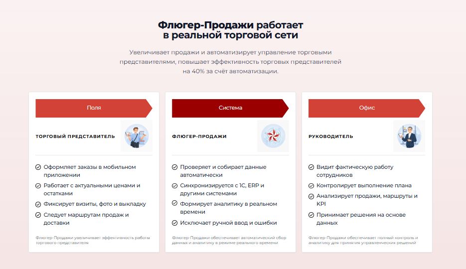 - Перестроили контент. Теперь сайт ведет пользователя от общего понимания управленческой проблемы (например, «отсутствие контроля над торговыми представителями») к тому, как «Флюгер-Продажи» её решает.