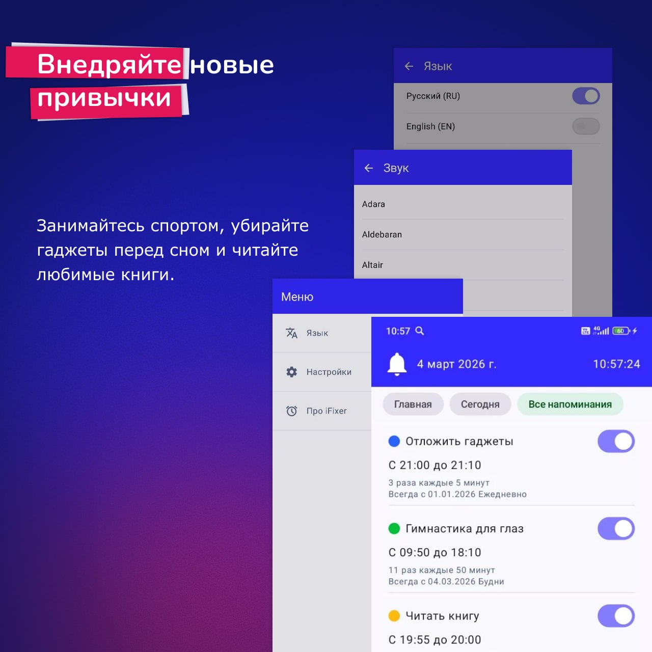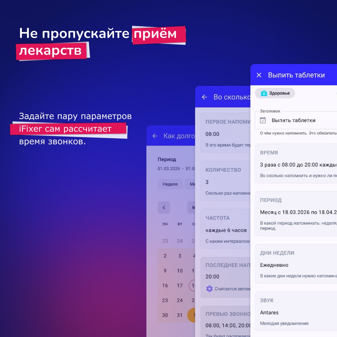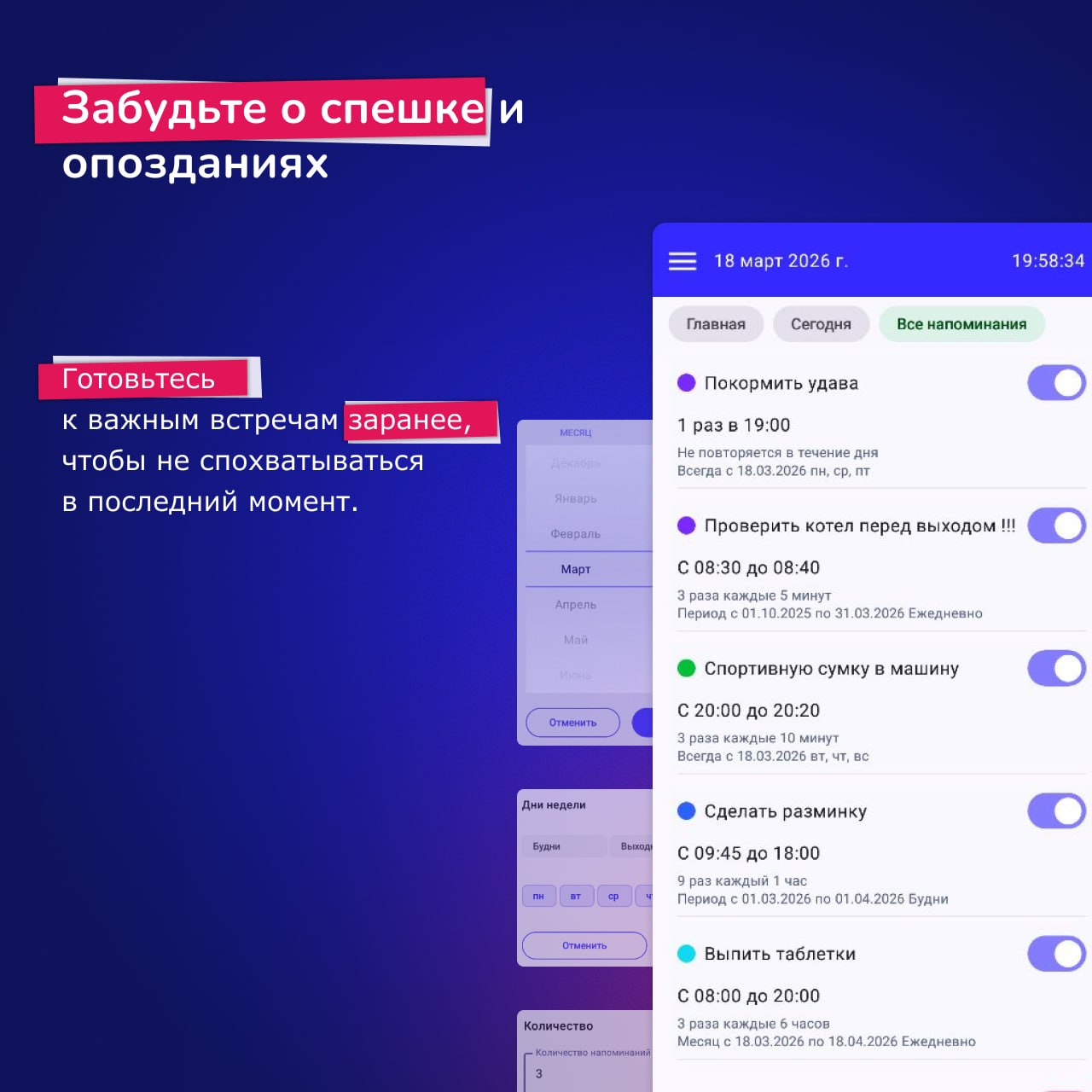 Достаточно один раз указать, что нужно делать и как часто об этом напоминать — дальше приложение само следит за временем.