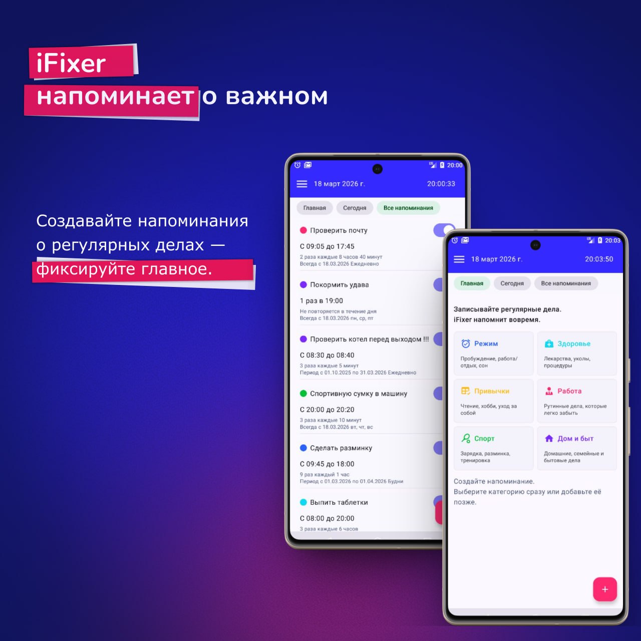 iFixer помогает вовремя вспоминать о регулярных задачах и избавляет от постоянного самоконтроля. Это личный помощник, который «держит в голове» десятки повседневных мелочей и мягко напоминает о них в нужное время.