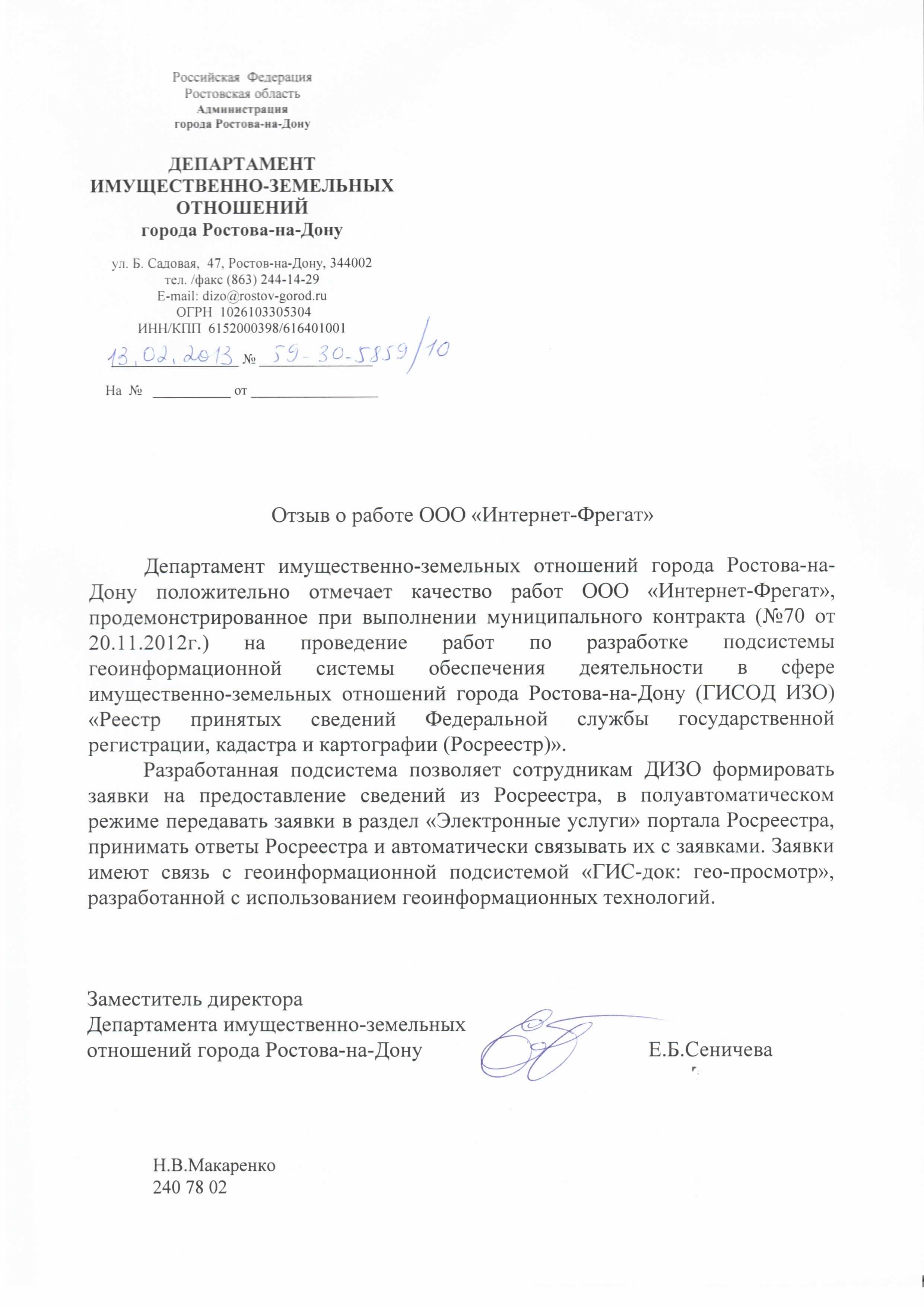 Департамент имущественно-земельных отношений города Ростова-на-Дону положительно отмечает качество работ ООО «Интернет-Фрегат», продемонстрированное при […] разработке подсистемы […] «Реестр принятых сведений из Федеральной службы государственной регистрации кадастра и картографии (Росреестр)»