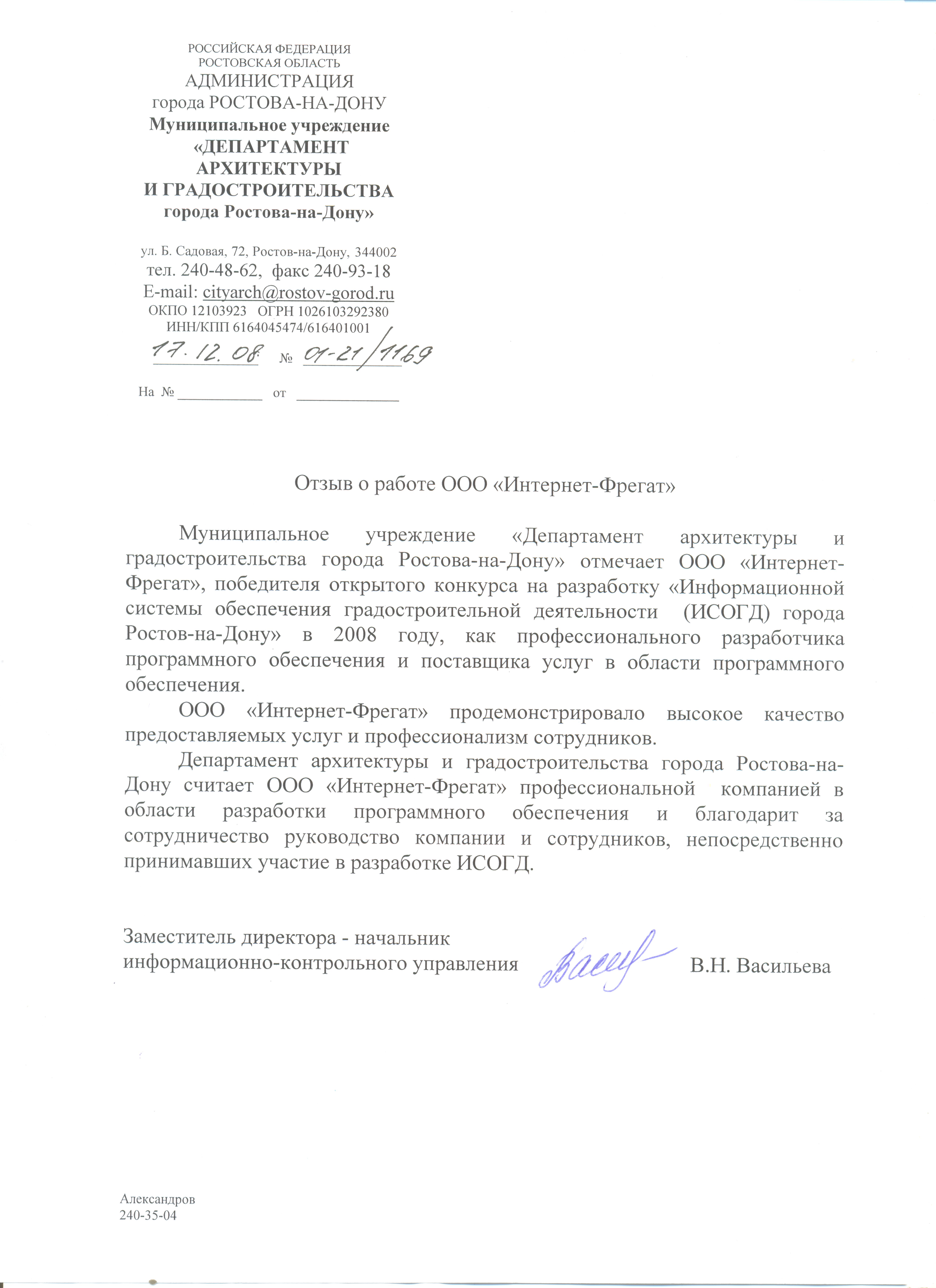 Муниципальное учреждение "Департамент архитектуры и градостроительства города Ростова-на-Дону" отмечает ООО "Интернет-Фрегат", победителя конкурса на разработку "Информационной системы обеспечения градостроительной деятельности (ИСОГД) города Ростова-на-Дону" как профессионального разработчика программного обеспечения и поставщика услуг в области программного обеспечения.